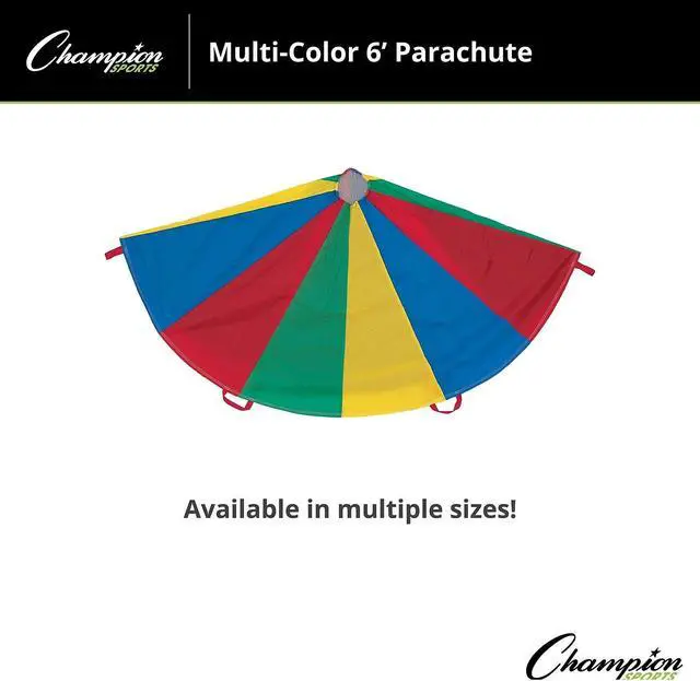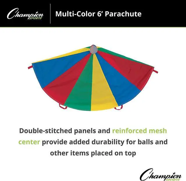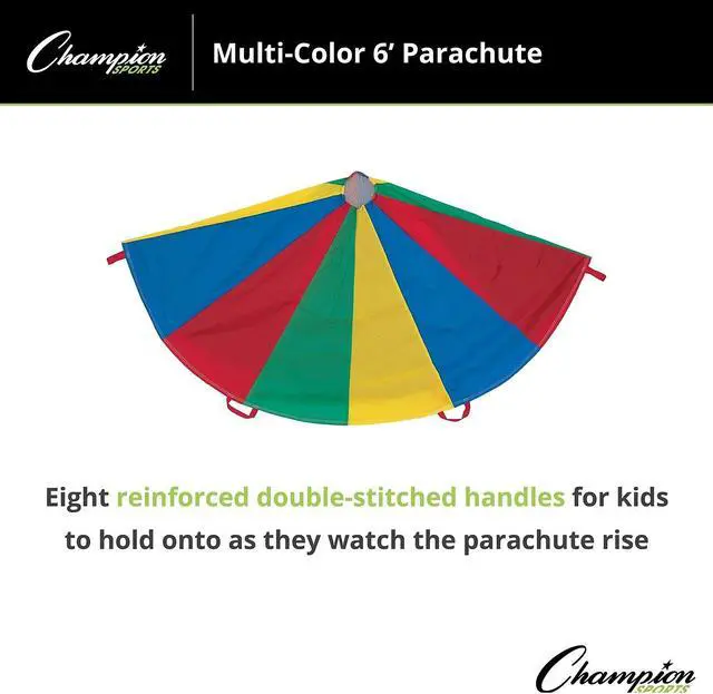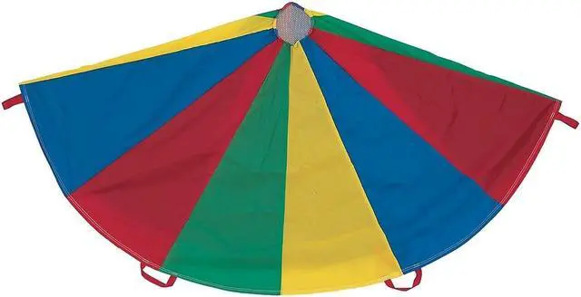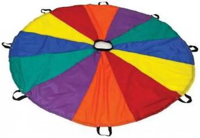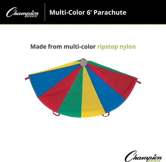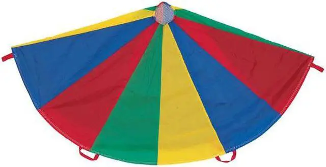 Teach kids the value of teamwork with this Multi-Colored 6 ft. Parachute. Made from multi-colored rip stop nylon, these parachutes have eight reinforced double-stitched handles for kids to hold onto as they watch the parachute rise. Double stitched panels and reinforced mesh center provide added durability for balls and other items placed on top. For use on ground only.