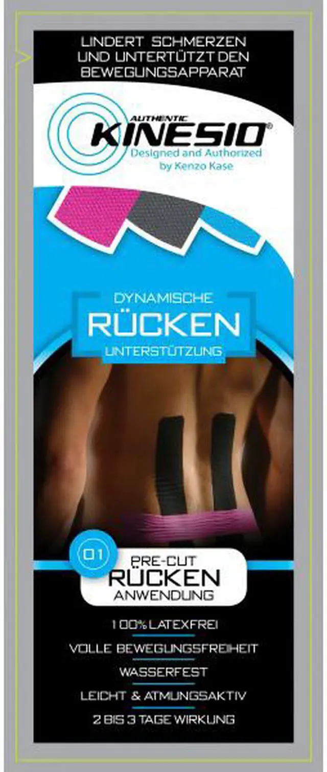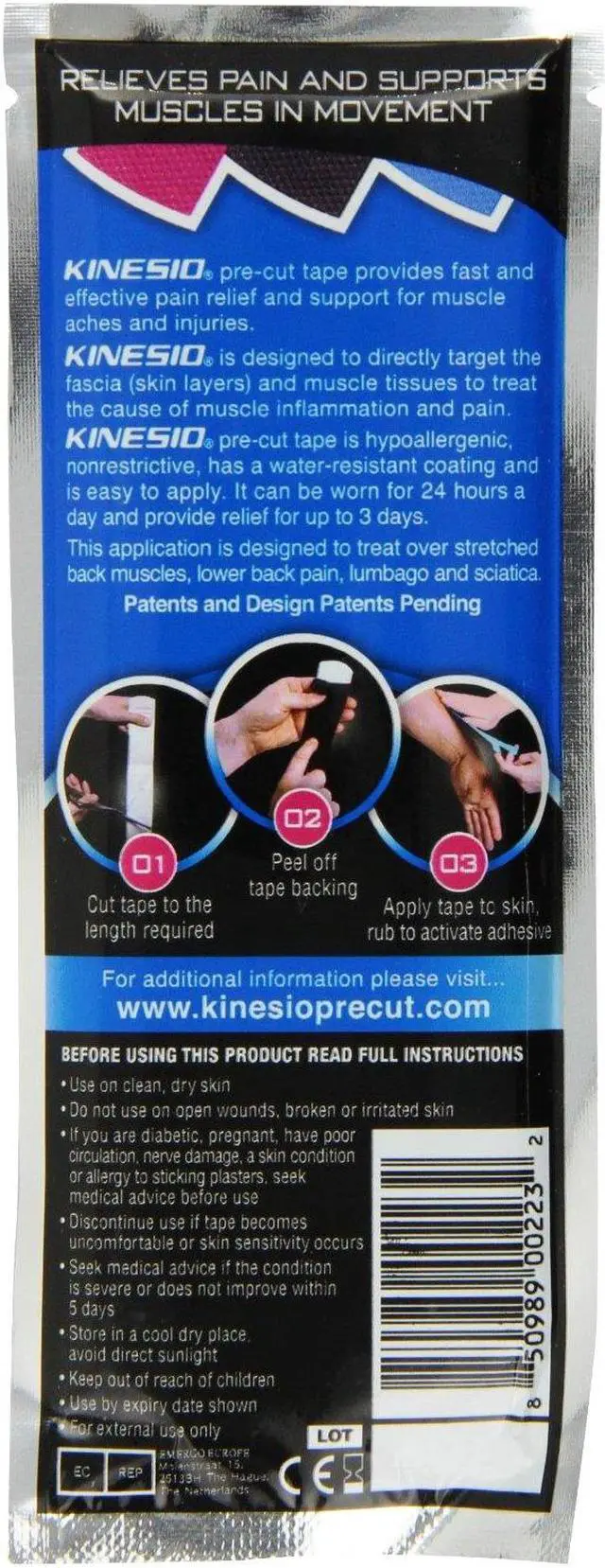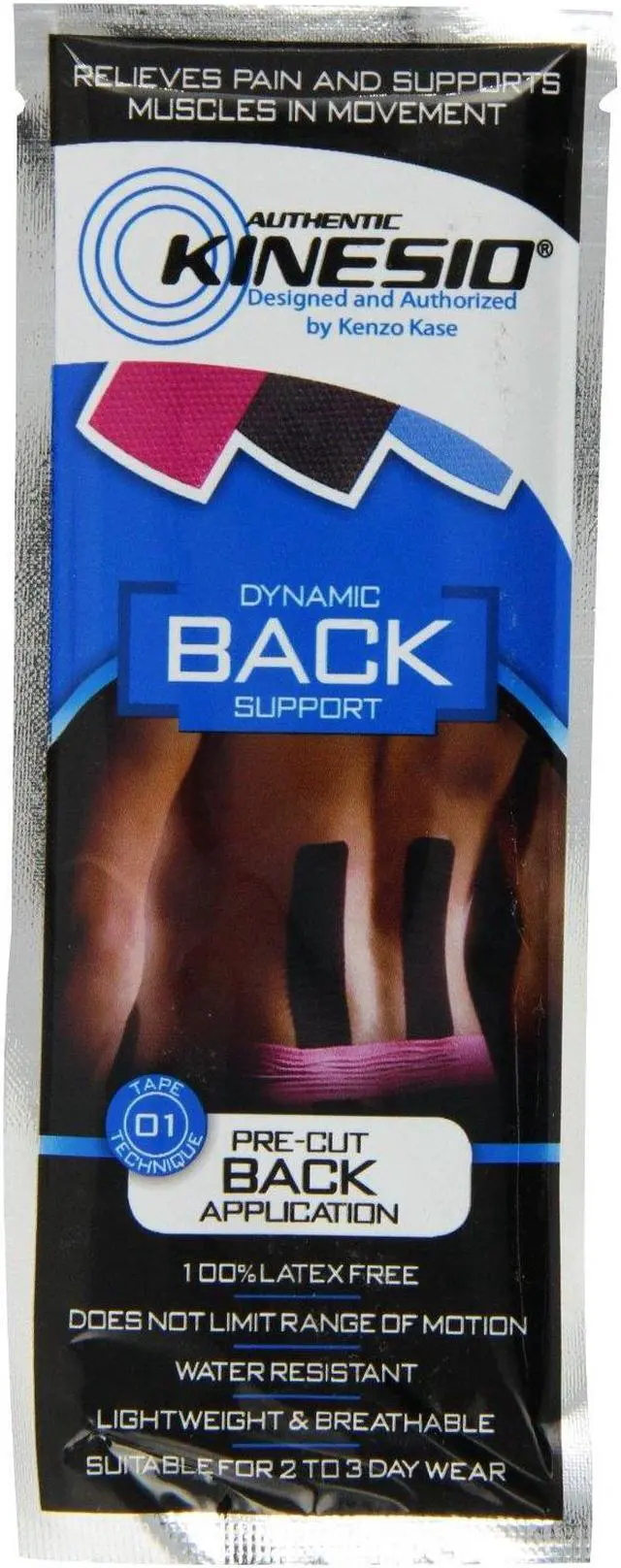 Kinesio pre-cut tape provides fast and effective pain relief and support for muscle aches and injuries. Kinesio is designed to directly target the fascia (skin layers) and muscle tissue to treat the cause of muscle inflammation and pain. Kinesio pre-cut tape is hypoallergenic, nonrestrictive, has a water resistant coating and is easy to apply. It can be worn for 24 hours a day and provide relief for up to 3 days.