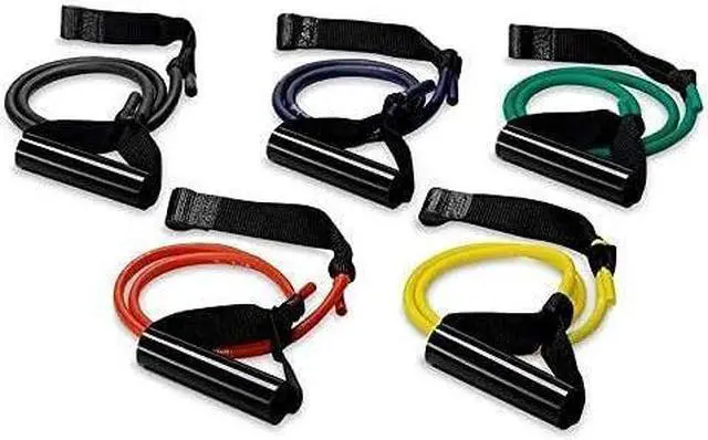 MULTIPLE RESISTANCES. Get a set of five resistance levels including one each of orange/medium, green/heavy, purple/extra heavy, black/special heavy, and dark green/super heavy. Each latex resistance tube is 3' long with a web anchor strap on one end and a handle on the other end.