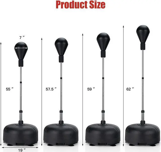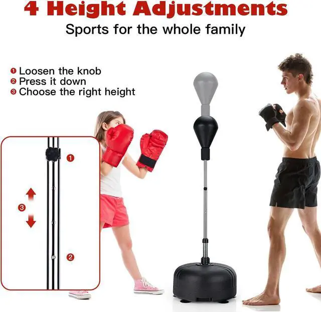 2.4 -Level Adjustable Heights: The boxing bag with stand features a 4-level adjustment function, allowing you to freely choose between the heights of 55"/ 57.5" /60"/ 62.5". Both kids and adults can quickly find the height that suits them to ensure the best boxing training experience.