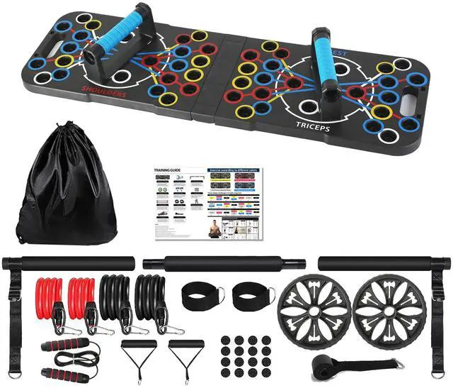Our home gym equipment set includes a variety of accessories for effective strength training, resistance training, and endurance development in the comfort of your own home. The foldable push-up board is designed with a color-coded system to provide efficient push-up positions for different muscle groups. Crafted from premium ABS material, it offers a load capacity of up to 300lbs and features anti-slip handles and non-slip pads for stability and reliability during exercise. This portable home gym set meets workout needs across various age groups and can be neatly stored in the included storage bag.