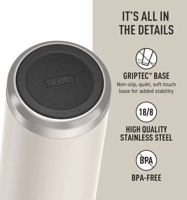 Stays cold: THERMOS vacuum insulation technology keeps drinks cold for up to 24 hours; No matter what unexpected adventures you encounter at least one thing can stay just the way you like it; Not for hot liquidsHygienic high-flow spout: Equipped with a RAPIDRATE high flow spout for optimal flow and DURASHIELD hygienic covered spout that includes a locking ring that helps secure the lid in placeDaily durability: Perfect insulated water bottle for daily use; Made with high-quality 18/8 stainless steel construction to provide everyday durability and reliability; Comes in a variety of colorsEasy