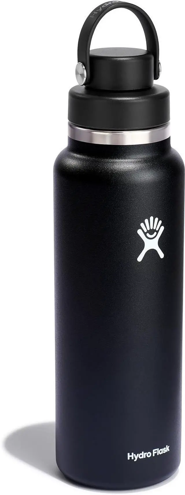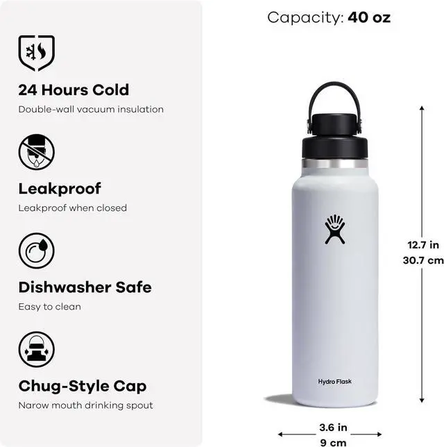 OZ BLACK BOTTLE: Refresh on the go with this Hydro Flask insulated stainless steel 20 oz Wide Mouth bottle and leakproof Chug Cap. The narrow chug spout provides a convenient controlled flow to quickly quench your thirst. The wide mouth cap easily fits ice cubes to keep things cool.