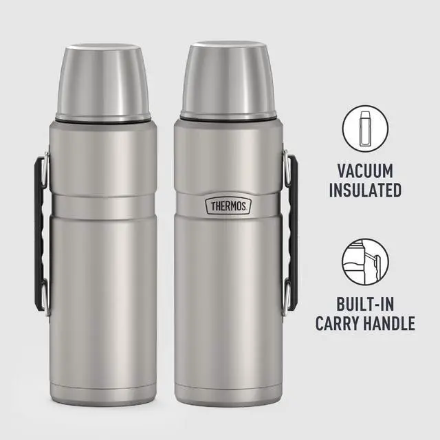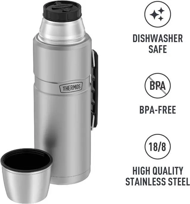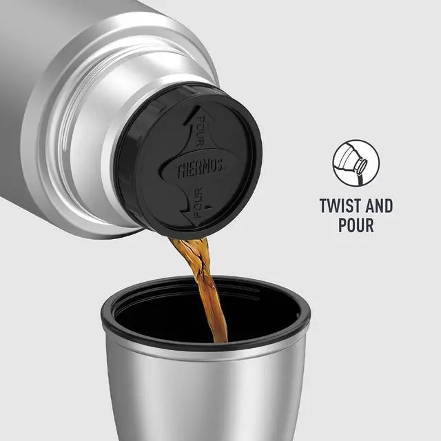 DURABLE: High quality 18/8 stainless steel construction is dependable all year round for long treks or road trips. Includes a built-in serving cup and carry handleSWEAT-PROOF: Exterior stays cool to the touch with hot beverages and sweat-proof with cold. THERMOS brand beverage bottles are dishwasher safe top rack recommendedTWIST