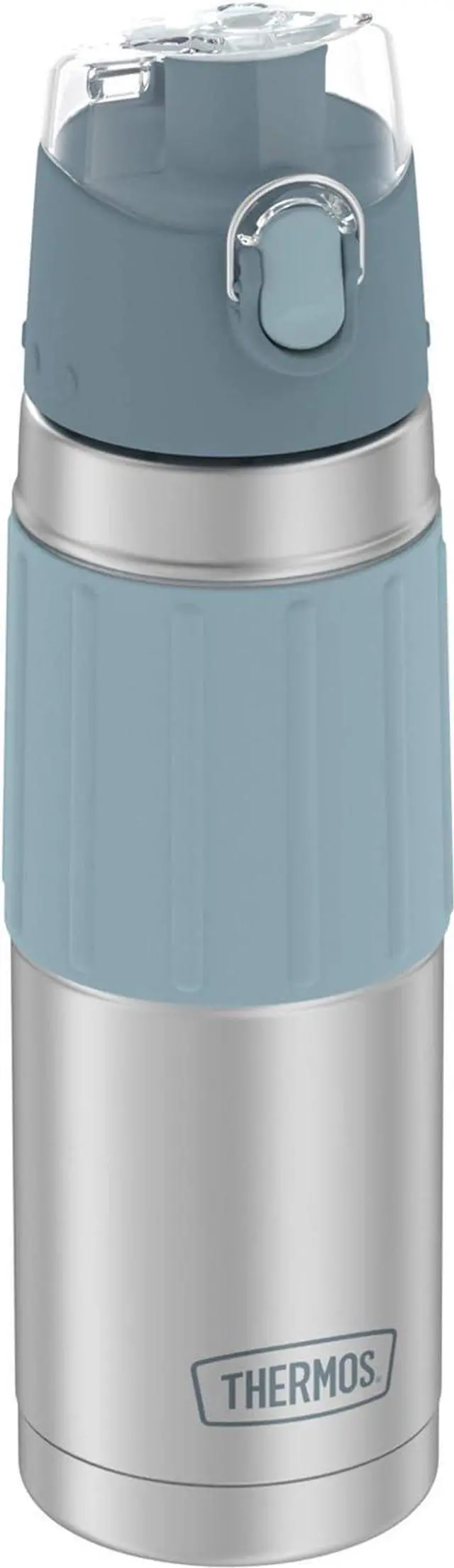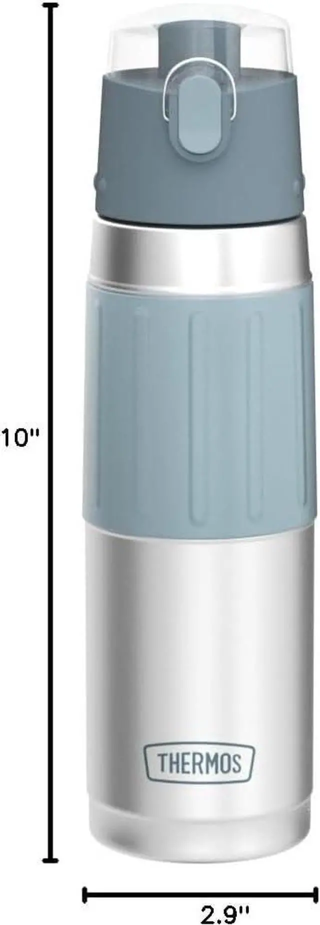 Thermos vacuum insulation technology for maximum temperature retention; keeps 14 hours coldDurable stainless steel interior and exterior; Stays sweat proof with cold beveragesPush button lid with locking ring secures beverages when closed; Rapid flow spoutSilicone sleeve is easy to gripFits most automobile cup holders