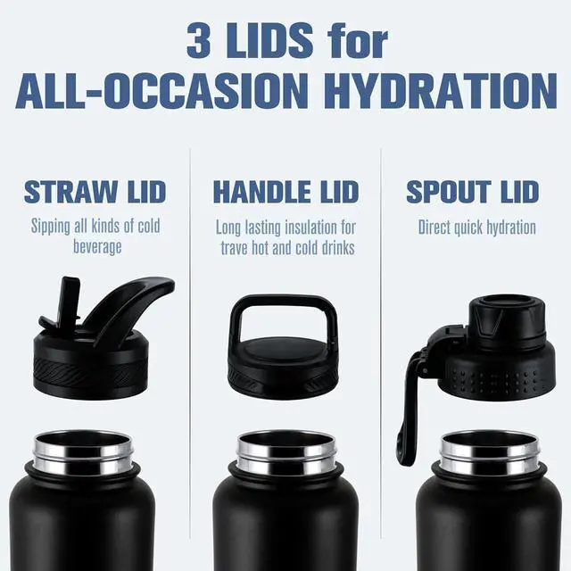 3 LIDS: YES the OLDLEY comes with THREE different 100% LEAK PROOF lids. These 3 caps are designed for convenient drinking on-the-go with a wide-mouth opening for quick ice filling and cleaning. The handle lid simplifies beach and camping adventures while the straw lid suits cycling and gym sessions. Plus the spout cover is perfect for hiking and hunting.