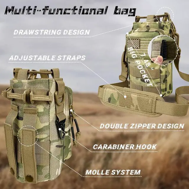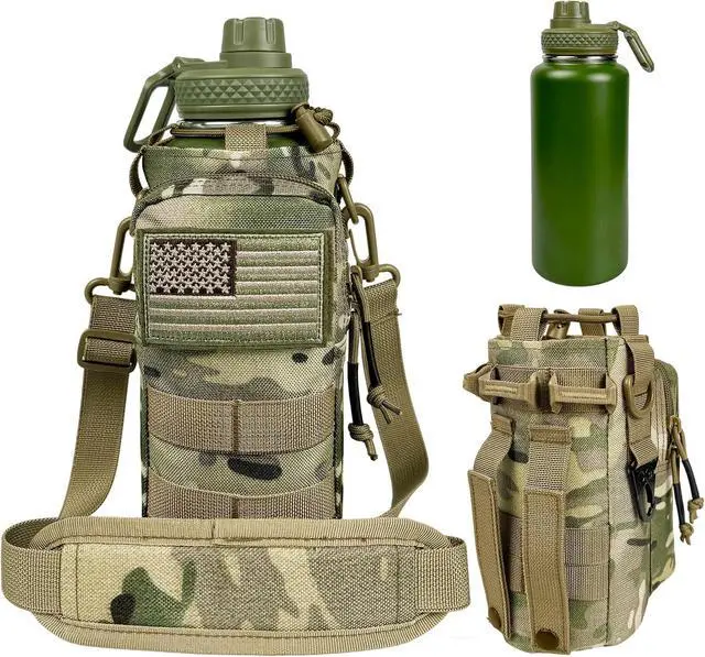 MULTIPLE CARRYING OPTIONS: The water bottle holder features an adjustable strap a metal clip and MOLLE systems for versatile carrying. You can choose from crossbody carry mode belt carry mode backpack mount mode or simply carry it by hand or attach it to your car. It is easy to add attachments and gear as needed and connect to other MOLLE equipment.