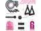 Adjustable Resistance Bands Set: 5 resistance levels, Pink 10 lbs, Medium pink 20 lbs, Blue 30 lbs, Grey 40 lbs, Black 50 lbs. Stackable exercise bands, both in 51", maximum resistance is 150 lbs