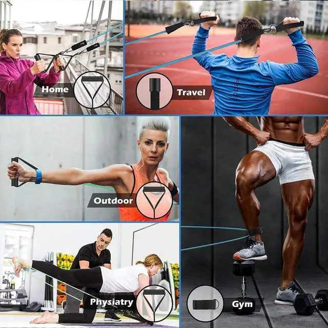 What Are Included: 5 Tube Resistance Bands, 2 Soft Cushioned Handles, 2 Ankle Straps, 1 Door Anchor, 1 Exercise Guidance, 1 Carrying Bag