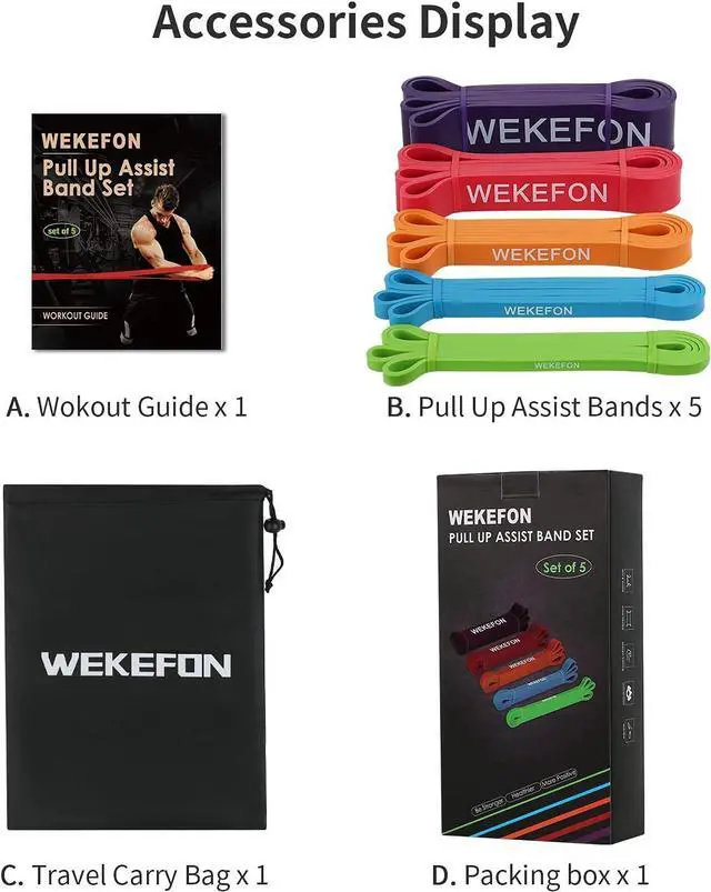 Why Need Set of 5 Pull Up Assistance Bands Each exercise band offers different level of resistance, If you are a newbie, you need to start working out from the least long resistance bands, As you get stronger youll need to lower the assistance to account for your new strength. Different fitness resistance bands are perfect for learning pull ups exercise, Powerlifting, Pilates, Mobility, Yoga, Stretching, Chin ups, Gymnastics, physical therapy, push-ups, barbell and dumbbell assist etc.
