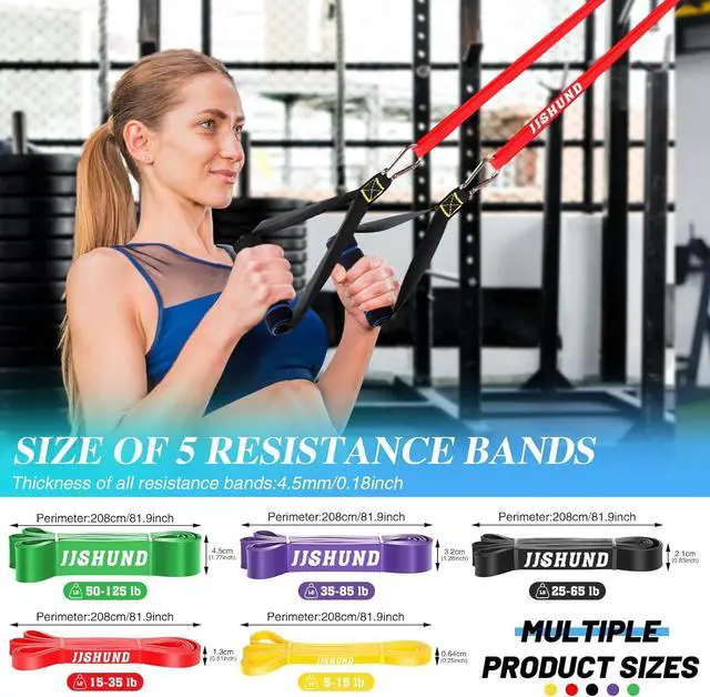 Resistance Band Set5 different strength exercise bands: yellow 5-15 lbs, red 15-35 lbs, black 25-65 lbs, purple 35-85 lbs, green 50-125 lbs, you can use them individually or in combination, and also comes with 1 door anchor, 2 handles, 2 carabiners, 1 instruction manual and 1 detailed promotional poster, 1 handbag. Help you build the body of your dreams!