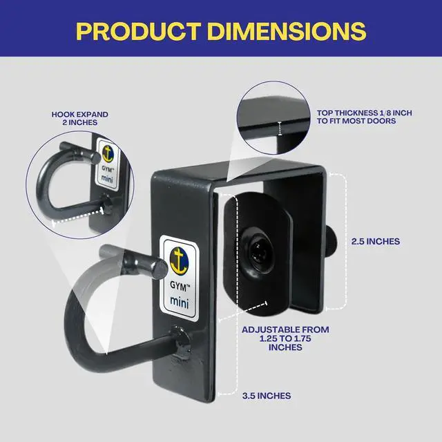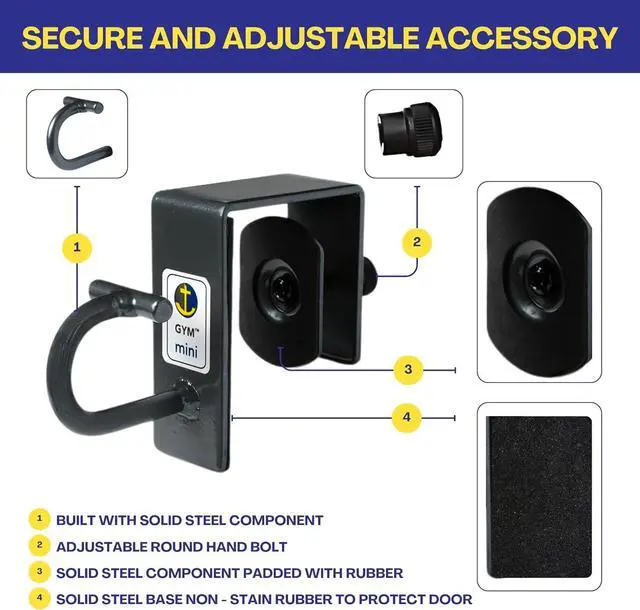 3[Heavy-Duty Build - Secure and Adjustable] This solid steel workout bands resistance door supports up to 300 lbs of resistance. The patented safety hook extends 2 inches to fit all common band attachments. Clamp fits doors from 1.25 " to 1.75 " thick.