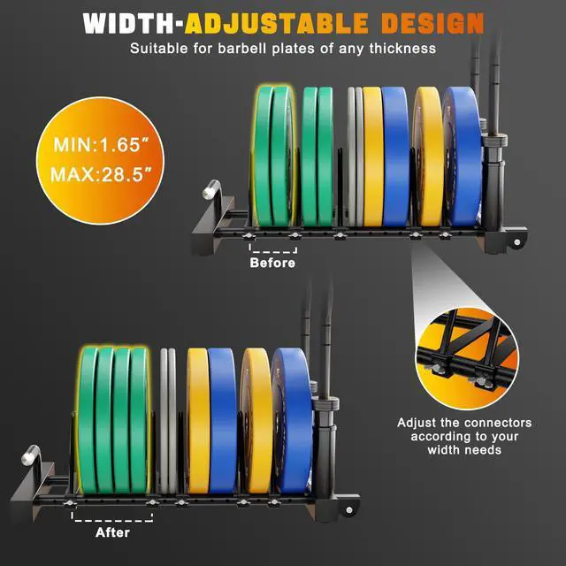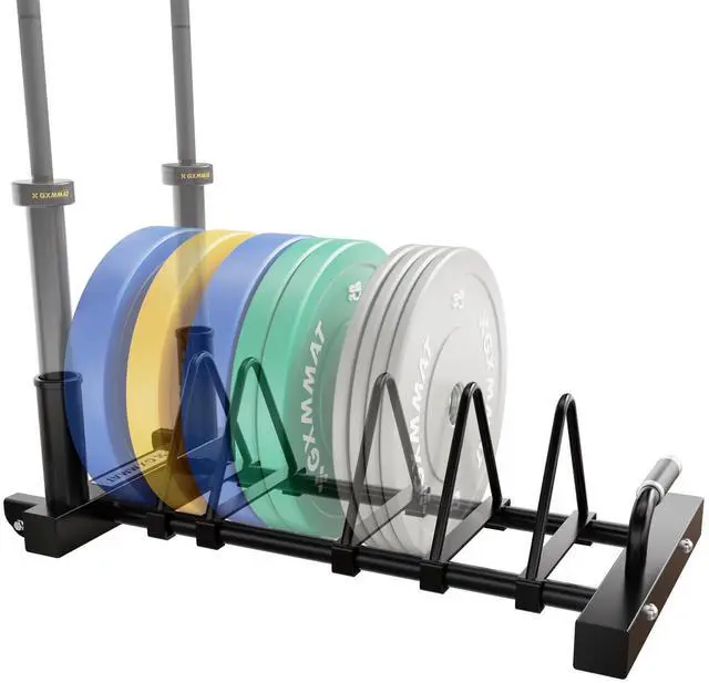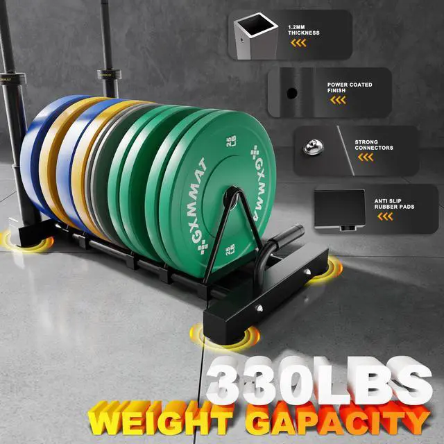 GXMMAT Horizontal Olympic Weight Plate Rack | 330lbs Capacity Powder-Coated Steel Frame | 4 Plate Storage Slots + 2 Barbell Holders | Adjustable Slot Spacing | Includes Wheels & Non-Slip Handles
