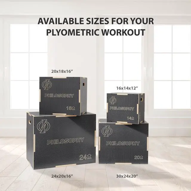 Our 3-in-1 non-slip plyometric boxes are marked in inches to be easily identified during your workout. These plyo boxes are available in the following sizes: 16" x 14" x 12" and weights 14.8 lbs, 20" x 18" x 16"and weighs 27.45 lbs, 24" x 20" x 16" and weights 33.6 lbs, 30" x 24" x 20" and weighs 52.7 lbs.