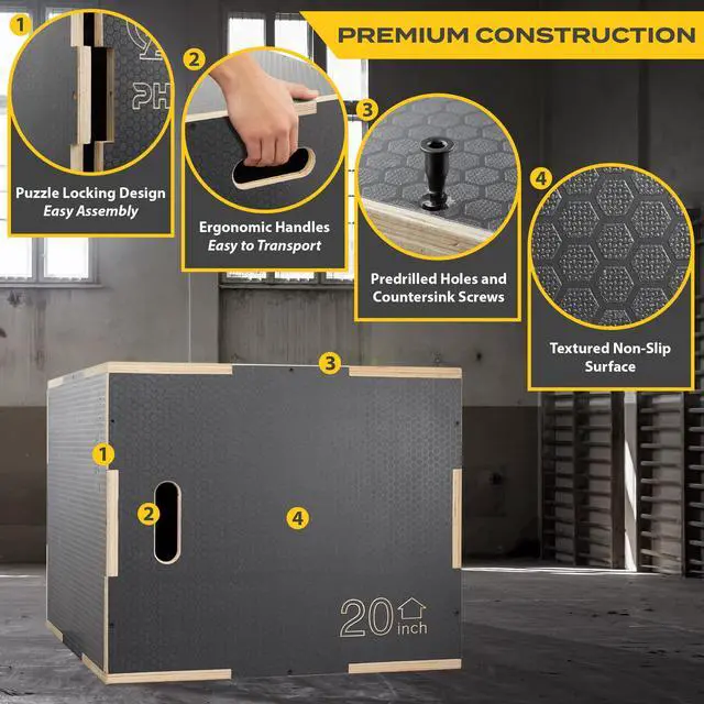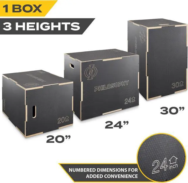 Every aspect of this exercise box was thoughtfully designed to ensure safety and to allow for maximum performance. Three different heights are available to meet your needs, whether you are aiming for greater or lesser challenges. Crafted of premium, high-grade plywood with a non-slip, textured finish. This plyometric box can support ample physical action. Internal braces are built-in for added support. Additionally, all edges are sanded smooth to ensure safety and to reduce the risk of injury. Whether you are jumping on it at full force, using it for steps, squats, or pushups, it will handle it all with ease.