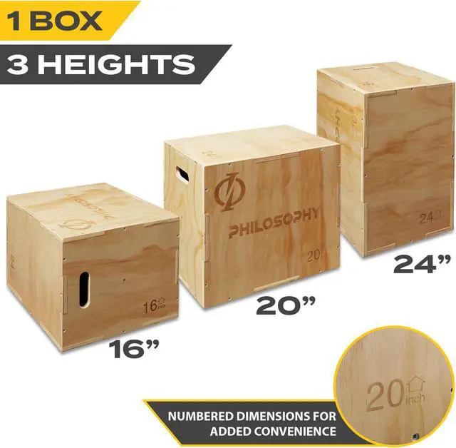 Every aspect of this exercise box was thoughtfully designed to ensure safety and to allow for maximum performance. Three different heights are available to meet your needs, with the dimensions numbered on the exterior for easy identification and added convenience. Whether you are aiming for greater or lesser challenges, this plyometric box is adaptable to your needs. Crafted of premium, high-grade plywood, this plyometric box features a puzzle locking design that can support ample physical action with ergonomic handles for portability. Internal braces (on the 3 largest sizes) are added for extra support. Additionally, the boxes have predrilled holes and countersink screws, and all edges are sanded smooth to ensure safety and to reduce the risk of injury. Whether you are jumping on it at full force, using it for steps, squats, jumps or pushups, it will handle it all with ease.