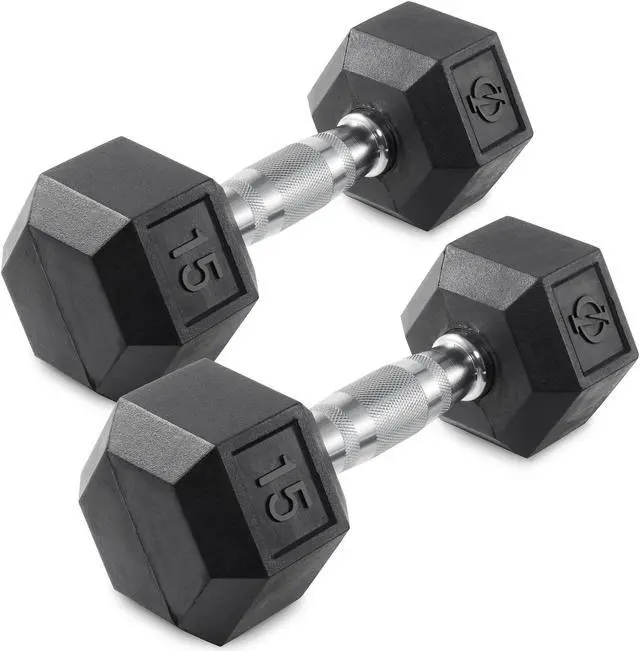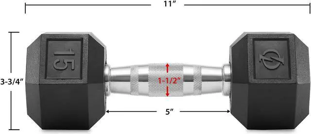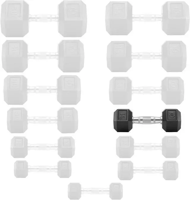 The rubber coated hex dumbbells feature a knurled ergonomic handle for a comfortable, secure grip. The hexagon shaped heads on each end prevent rolling during your workout and provide an easy storage option when they are not in use. The weights are sold in multiple options including both as a single dumbbell or a set of two. The dumbbells are marked in pounds to easily identify during your workout. They are available in the following individual weight options: 3, 5, 10, 12, 15, 20, 25, 30, 35, 40, 45, and 50 pounds.
