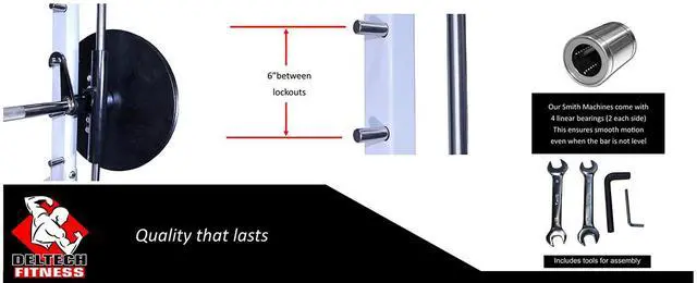 The DF4900s Olympic bar glides on four precision linear roller bearings that ride on polished solid steel bars. The DF4900 moves effortlessly to recreate the free weight feel but with the safety and stability of a smith machine. We encourage you to find another linear bearing machine in this price range. You wont. Rear plate holders are added to the back for convenient loading and unloading of the machine. As far as smith machines go, this one may be one of the most versatile on the market. Deltech Fitness designed this machine with a pull-up bar and provisions for future upgrades such as the Lat Attachment (DF830) or the Stack Loaded Lat Attachment (DF838).