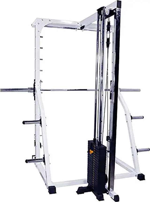 The Deltech Fitness DF4900LS Smith Machine with Stack Loaded Lat Attachment delivers rock-solid commercial strength and quality at an affordable home unit price. Heavy-duty steel construction coupled with great quality creates a recipe for a confidence-inspiring, smooth operating machine. With an overkill 700 lb weight capacity, theres not a workout that will exceed its limitations.