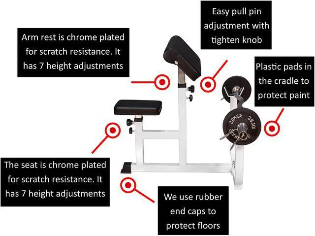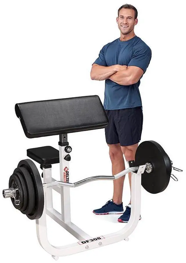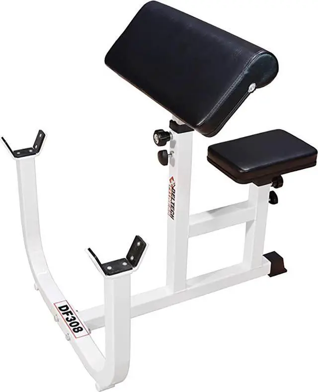 Blast your biceps with this heavy-duty preacher curl bench by Deltech Fitness. This versatile bench is designed for users of all sizes and is fully adjustable to maximize your workout. The arm pad is set at a 45-degree angle and adjusts in height from 33" to 43" in 1" increments. The seat pad adjusts in height from 18-1/2" to 24-1/2" in 1" increments. Perfect for use with a preacher curl bar and weights or isolate each arm by using dumbbells. The maximum weight capacity for this bench is 500 lbs.