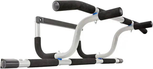 Easily hooked over any open doorway in your home, this elevated pull-up bar offers three grip positions to target distinct muscle groups for better workouts every day. Quickly change to push-ups, dips, and sit-ups on the floor by using this machine as a brace. For sweat-free assembly, this exercise equipment leverages your body weight to lock onto the doorframe, no screws or drilling required. The universal-fit expandable bar secures snugly to residental doorways between 24 and 36 inches with molding up to 3.5 inches wide.
