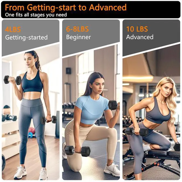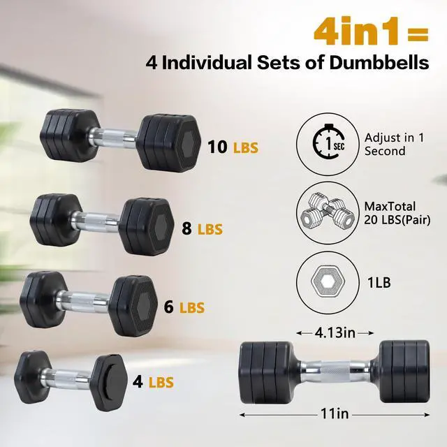 4-IN-1 ADJUSTABLE WEIGHTS, TOTAL 20 LBS VALUE PACK Each dumbbell offers 4 detachable weight levels: 4lb, 6lb, 8lb, and 10lb. The set of 2 totals 20 lbs, eliminating the need to buy multiple single dumbbells. Perfect for beginners to intermediate fitness enthusiasts, it adapts to your growing strength needswhether youre doing bicep curls, shoulder presses, lunges, or full-body circuits. 1-SECOND QUICK ADJUSTMENT No more tedious screwing or disassembling! Our innovative 1s-adjust mechanism lets you switch between weight levels in just one second with a simple slide of the adjustment lever. Stay in the zone during your workout without wasting time on equipment changesideal for high-intensity interval training and fast-paced routines.
