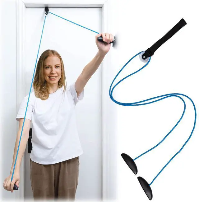 - The shoulder pulley is an apparatus that's hooked over the top of a door, with a small pulley system near the top, and a rope with handles that hangs down from the pulley.