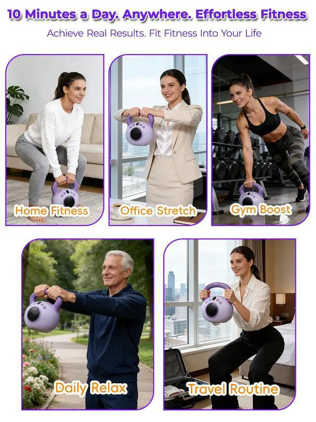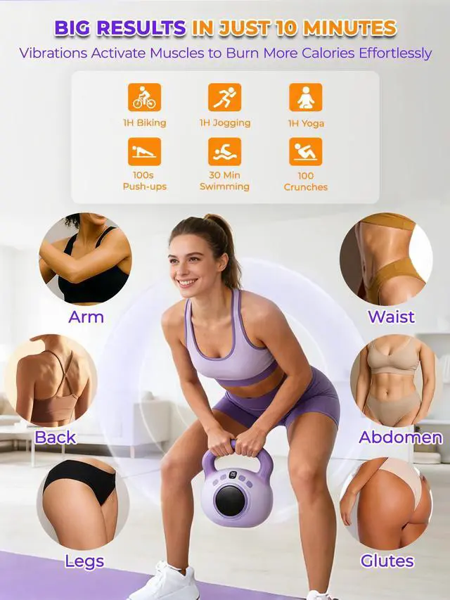 Active Fat Loss & Body Sculpting Big Results in Just 10 Minutes This kettlebell combines active movement with vibration to engage deep muscle fibers and boost calorie burn. Just 10 minutes a day of simple swinging or holding activates the core, arms, shoulders, and back to sculpt lean curves, tone muscles, and burn fat. Compared to vibration plate exercise machine that rely on passive standing, it delivers more efficient muscle activation and faster shaping results.