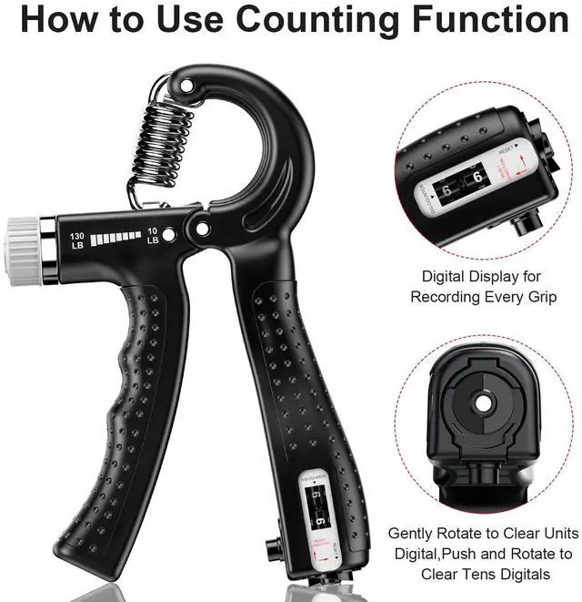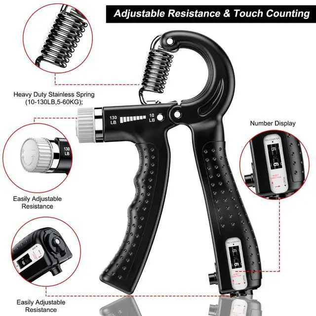 - Solid ABS material is safe and non-toxic. The heavy-duty stainless steel spring can easily adjust the grip between 10-130LB and 5-60KG. The comfortable handle also has a counting function to increase training goals.