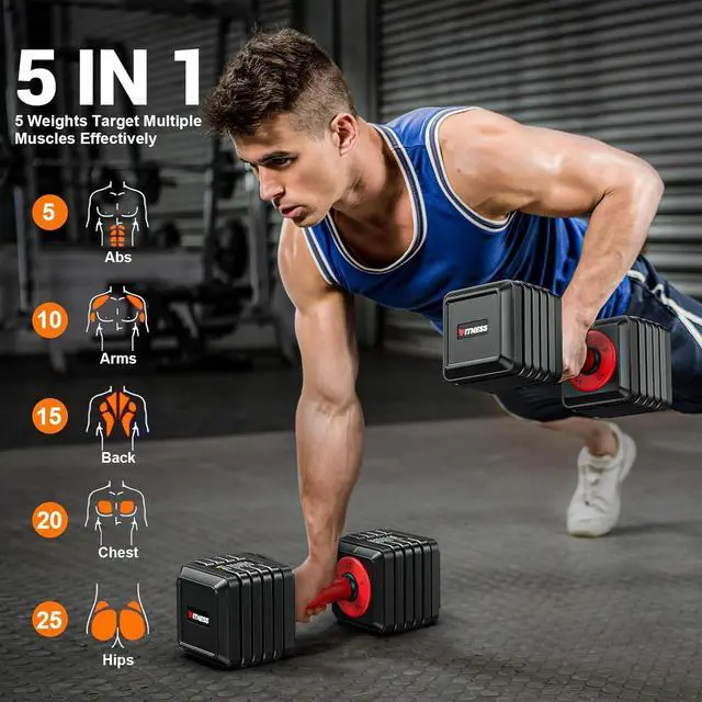 5 Weights in 1 Adjustable Dumbbell: Rendpas Adjustable Weights Dumbbells Set offers a comprehensive weight range with a 5-in-1 system that can meet different workout needs; This adjustable dumbbell set can be rotated between weights ranging from 5 lbs to 25 lbs, increasing by 5 lbs with each turn, taking you from beginner to advanced levels and providing a comprehensive range of weights