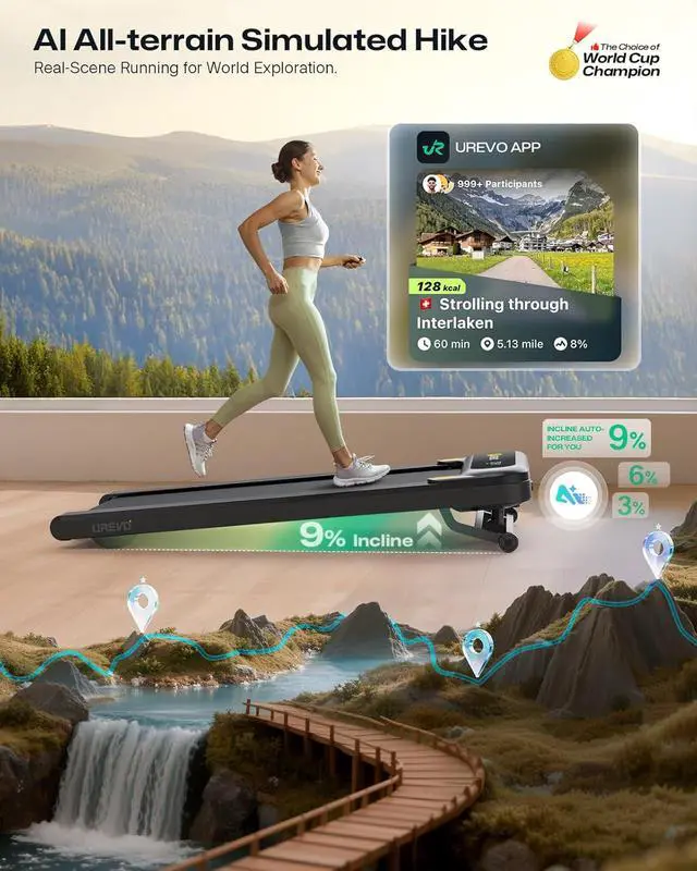 AI-Powered Your FitnessUREVO treadmill syncs music and guidance to enhance your efficiency and motivation more scientifically. The smart HIIT capabilities and immersive, realistic scenes make each session both enjoyable and highly effective. Experience intense calorie burning while staying engaged, ensuring every workout is results-driven and tailored to your fitness goals.