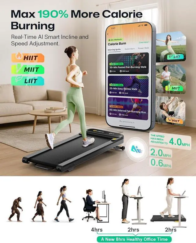 Efficient Calorie BurningSpacewalk 3S smart walking pad treadmill is designed with a 9% auto incline, enhancing calorie-burning efficiency. Simply one key to invoke the automatic incline via the remote control or UREVO APP.