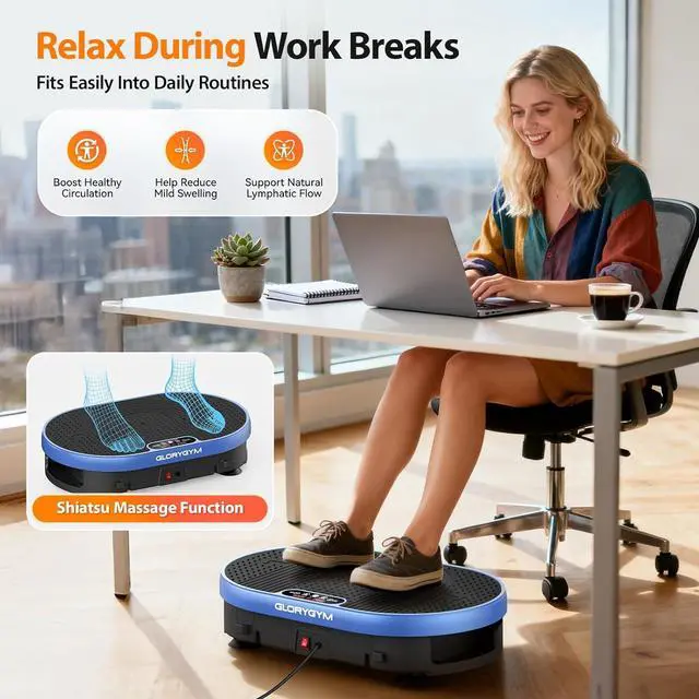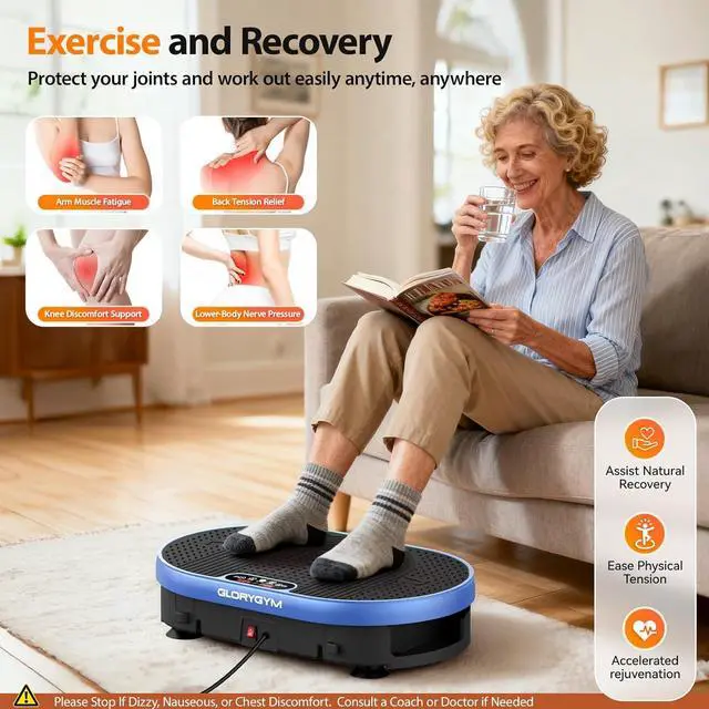 Muscle Strengthening & Joint Recovery: The Glorygym vibration platform uses low-impact vibrations to enhance blood circulation, promote lymphatic drainage, and reduce joint pressure. Regular use helps to build muscle strength, increase bone density, improve flexibility, and support overall recovery;