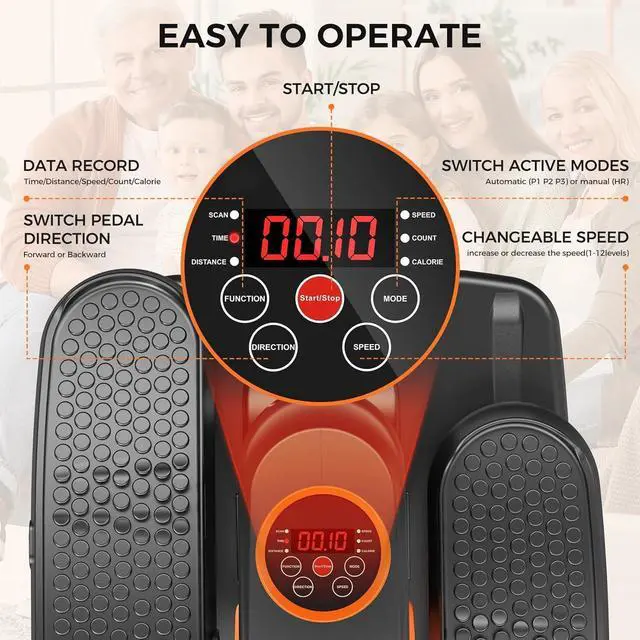 LCD DISPLAY & REMOTE CONTROLThis pedal exerciser features an intuitive LCD display that shows speed, distance, time, calories burned, and step count in real time, helping you monitor your workout progress effortlessly. With both a touch panel on the machine and a convenient remote control, you can easily adjust settings without bending over, reducing strain