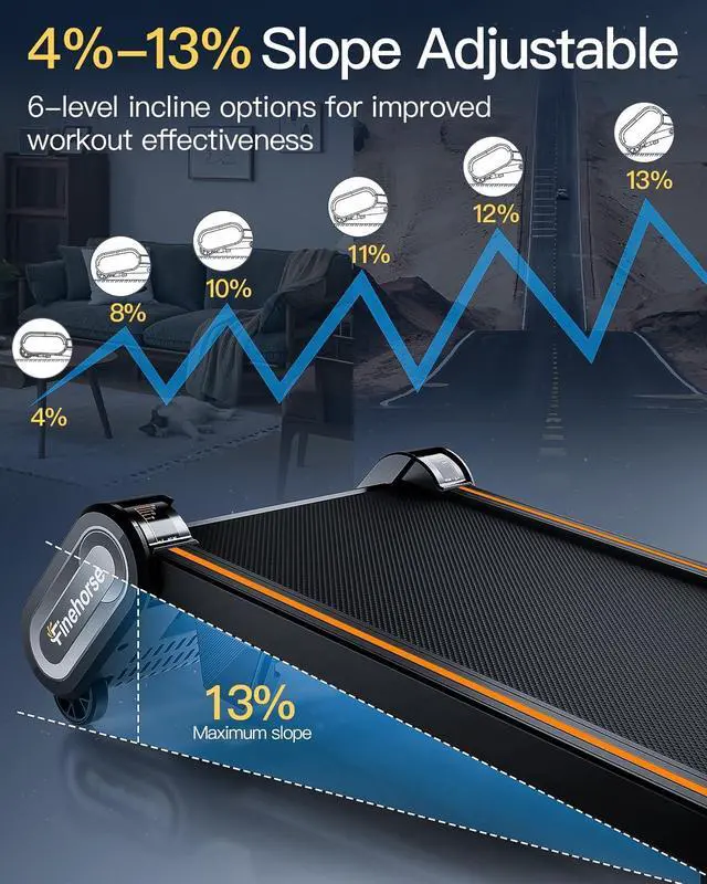 Treadmill with Auto Incline: Up Pad incline treadmill offers six adjustable incline levels (4%, 8%, 10%, 11%, 12%, 13%), catering to diverse workout and fitness aspirations. It simulates the challenging terrain of mountain climbs, enabling an intense calorie burn that targets and tones your waist and leg lines. Achieve your fitness goals with precision and efficiency, powered by this walking pad treadmill