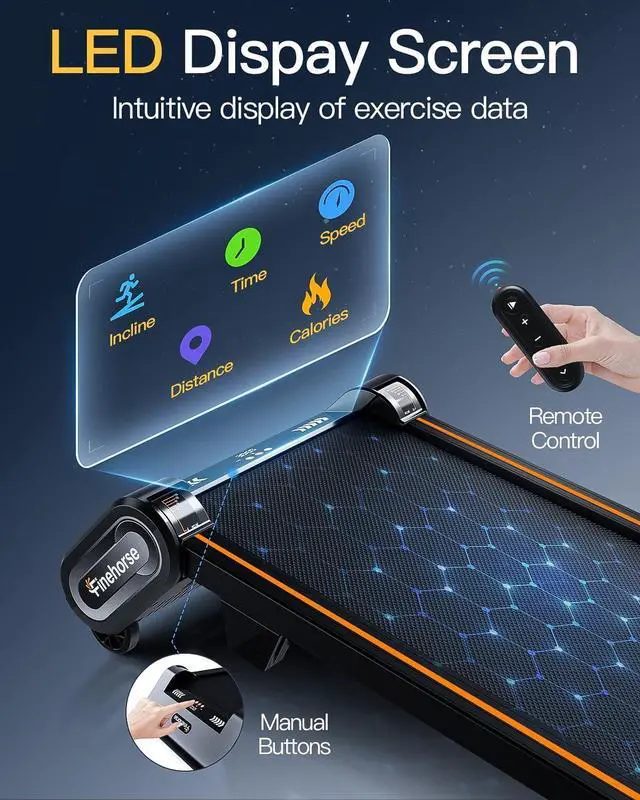 Multi-Function LED Display: Up Pad portable treadmill for home built-in LED display control panel, three buttons on the panel provide convenient operation. During use, you can track current incline level, calories, speed, time and distance in real time. The remote control with bracelet that easily wrapped around your wrist, freeing up your hands for a more seamless experience