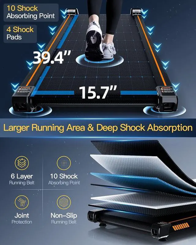 Wider Running Belt & Shock Absorbers Design: Under desk treadmill is designed with a 6-layer running belt, equipped with 4 shock absorbers and 10 shock-absorbing pads, which can effectively reduce noise disturbance and meet the needs of exercise. Up Pad treadmill is equipped with a longer running belt with a size of 15.7 ' ' x 39.4 ' ', which can greatly reduce the impact force during exercise, protect knees and ankles, and prevent joint injuries