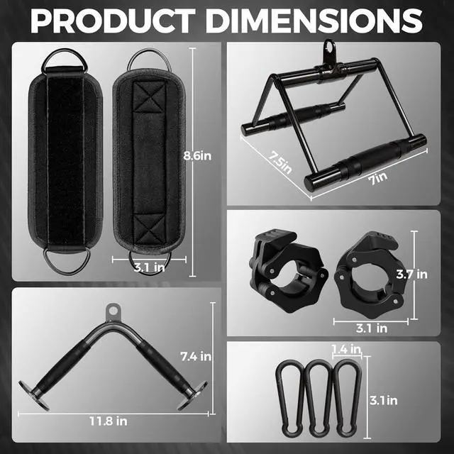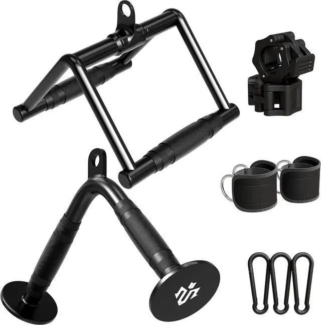 What' s IncludedThe cable attachments for gym include one V-Shaped Bar, one Double D Handle, two Barbell Clamps, two Ankle Straps, and two Snap Hooks. All attachments are designed to fit most standard cable systems