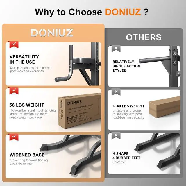 Multi FunctionOur power tower supports a variety of upper body and strength workouts, such as pull-up, push-up, leg/knee raise and dips. Multiple handles in pull-up frame also allow you to perform more postures and exercises. Good choice for strengthening and shape your whole body.