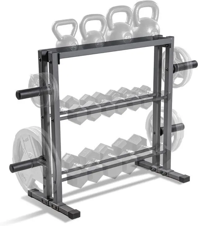 THREE-TIER UNIT & FOUR EASY ACCESS POSTS Store your fitness accessories on this multifunctional rack with uniquely constructed 3-layer rack and 4 storage posts that allows for dumbbell set, weight set, and other weightlifting tools all in one place