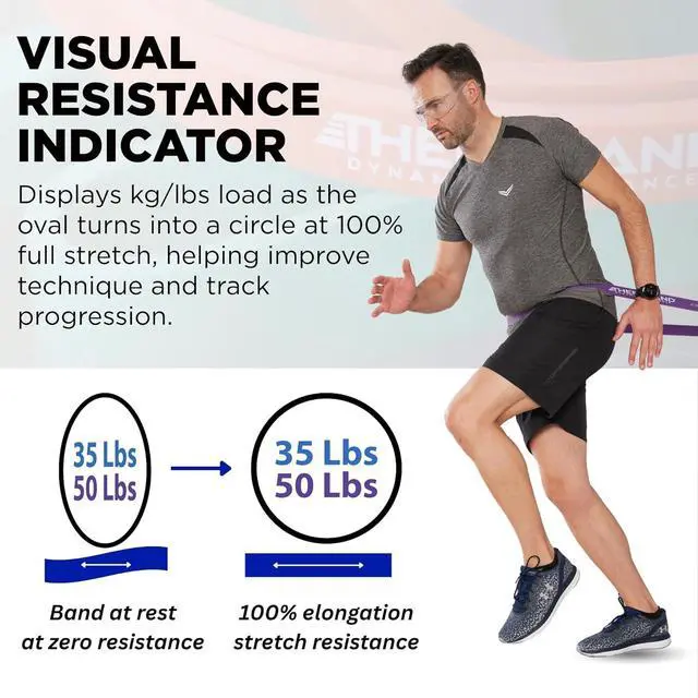 Elastic resistance band features the exact pounds of resistance printed onto the band with a visual indicator to track progress and improve results