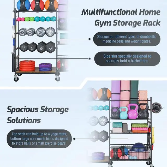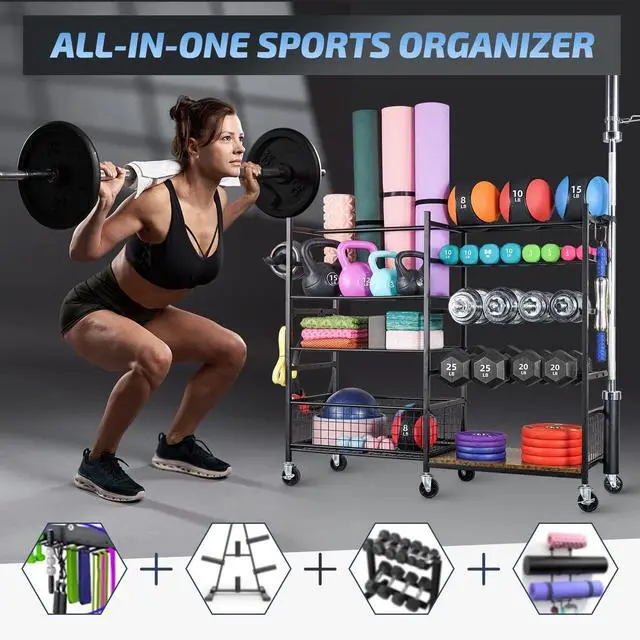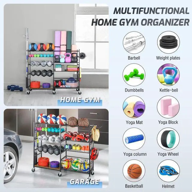 Multifunctional Home Gym Organizer: Organize your exercise gears and sports equipment with ease using this versatile storage rack designed for dumbbells, kettlebells, barbells, yoga mats, medicine balls, basketballs, footballs, gloves, skateboards, and more.
