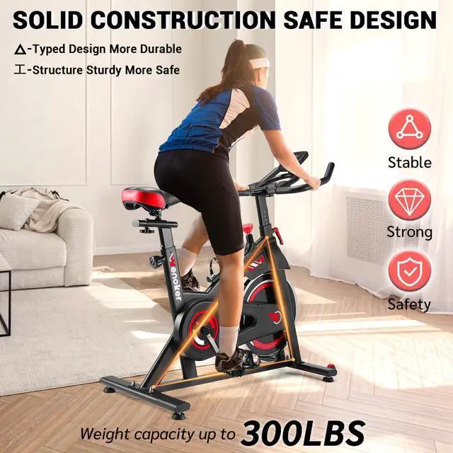 [Upgraded Exercise Bike & Reliable Brand] After years of research, WENOKER released this upgraded exercise bike. It has thicker heavy duty aluminum steel construction and updated 7-shaped front handlebar post knob which make sure the exercise bike sits firmly on the floor so it wont rock or wobble while you ride. Sleek black and red styling will look chic in your home or workout space.