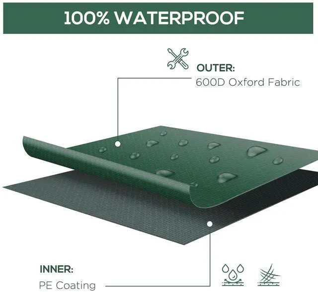 If you need to protect your outdoor furniture our cover is not only high quality but looks fantastic. The material is not a cheap lightweight cover, but is durable, with weather proofing and UV proofing. This keeps your furniture dry and the furniture cover looking good, even after years of use. The cover is quick and easy to slip on and off your furniture with an easy to use draw string that synches it down and keeps it on. This furniture cover is designed for most medium size outdoor furniture sofa sets (5-7 pieces), but can be used to cover many different items as well, please check sizing before ordering. Features: - Protects against rain, snow, dust, and bird droppings - Heavy weight fabric - Vinyl coated - Treated to repel rain and protect against water damage - Draw strings synch, for a tight fit - Easy on and off Specifications: - Dimensions: 26.25T x 65.5D x 97L - Color: Green