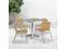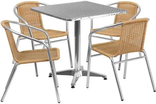 Create an enjoyable dining experience with this table set that will enhance your bistro, cafe, restaurant, hotel or home patio space. The designer style stainless steel table top features a smooth surface for keeping items level. The column and base are constructed of lightweight aluminum material. The chair is lightweight and easy to move and store. For easy storing and cleaning purposes these chairs stack up to 20 chairs high. This set was designed for all-weather use making it a great option for indoor and outdoor settings. For longevity, care should be taken to protect from long periods of wet weather. Whether you are just starting your business or upgrading your furniture this set will complete the look.