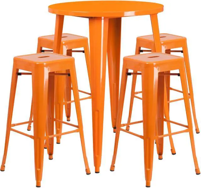 Complete your dining room, restaurant or patio with this chic bar table and chair set. This colorful set will add a retro-modern look to your home or eatery. Table features a smooth top and protective rubber floor glides. The stackable barstools feature plastic caps that prevent the finish from scratching while being stacked. This 5 piece table set is designed for indoor and outdoor settings. For longevity, care should be taken to protect from long periods of wet weather. The possibilities are endless with the multitude of environments in which you can use this table, for both commercial and residential spaces.