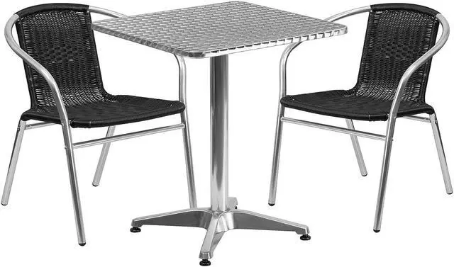 23.5'' Square Aluminum Indoor-Outdoor Table Set with 2 Black Rattan Chairs