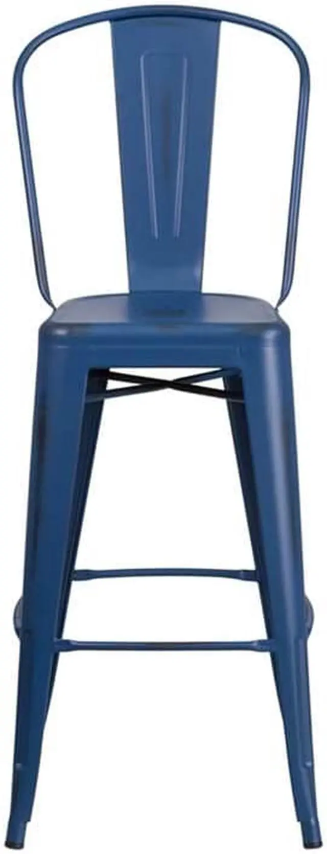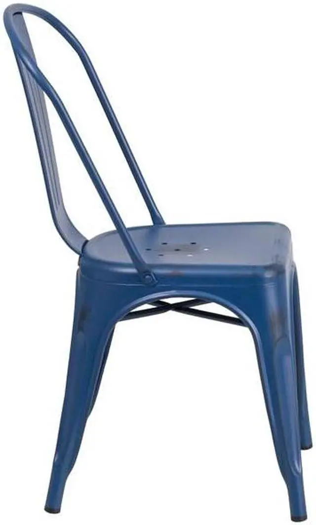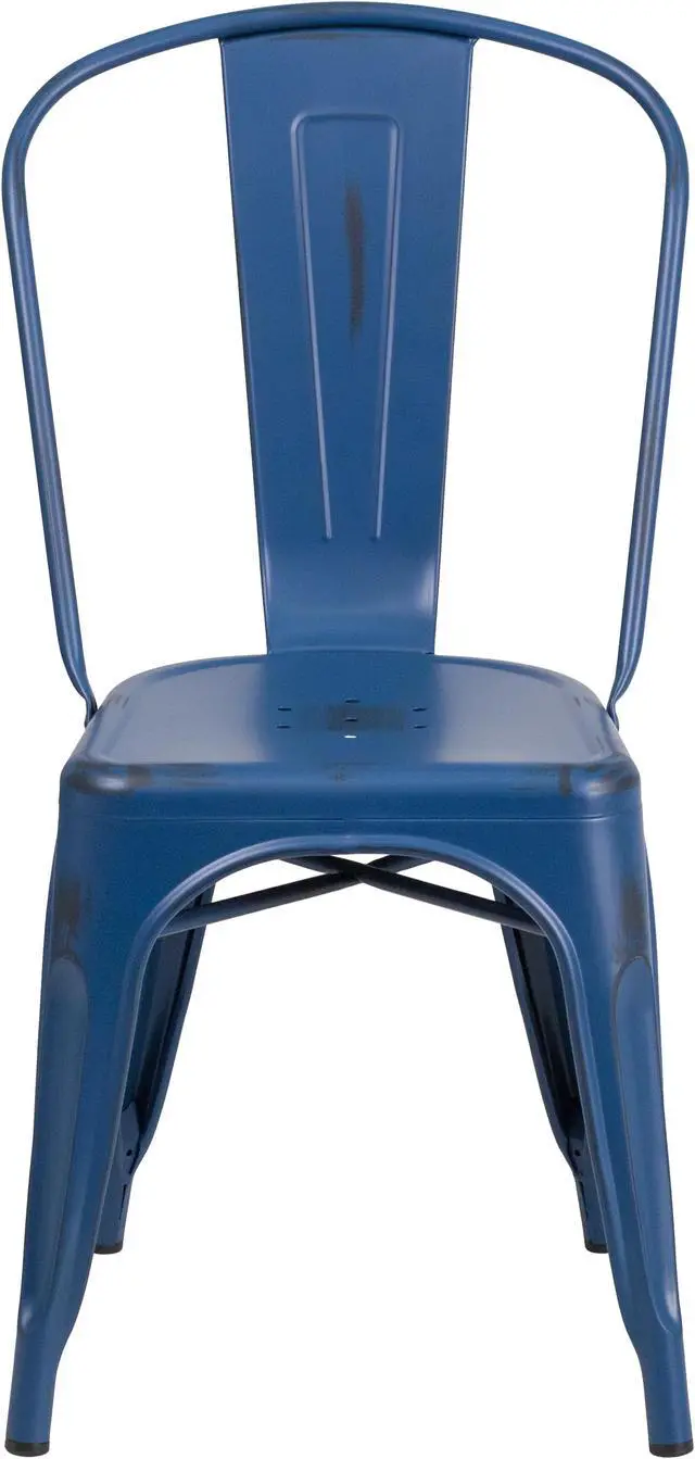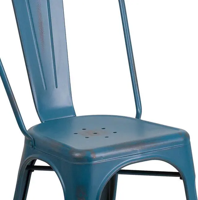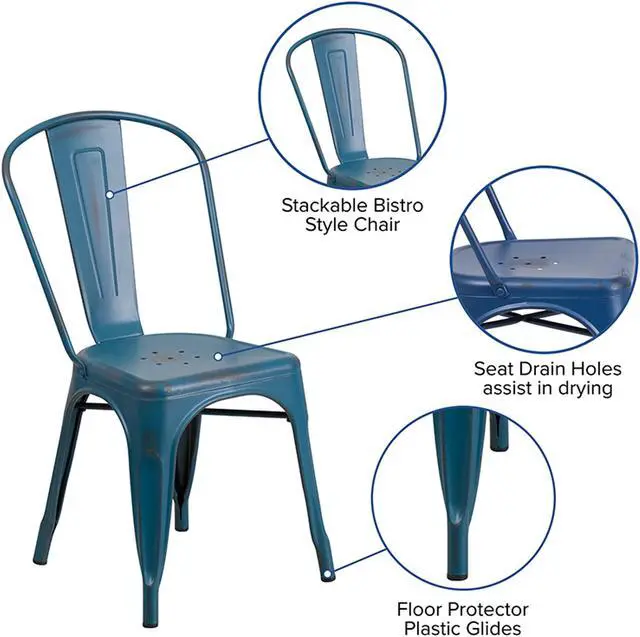 The distressed metal chair features a curved back with a vertical slat along with a stabilizing cross brace. Your colorful dining chair will last longer thanks to the plastic bumper guards that protect the chairs' finish when stacked. While being used outside on the deck, pool or patio, you'll be delighted to find that these outdoor stacking chairs include drain holes to prevent pooling in the center of the seat. This translates to quicker seating turnaround times in your busy establishment. This trend-setting indoor outdoor dining chair will make a great addition to your kitchen, dining room or restaurant.