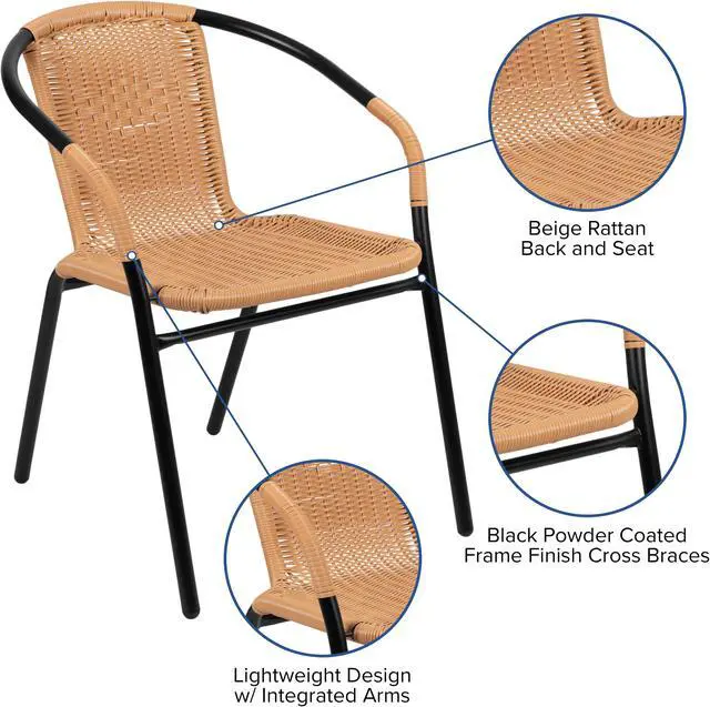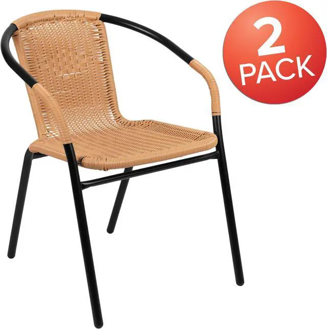 Complement your terrace and patio with these beautiful rattan chairs to surround a patio table or to seat waiting guests in the lobby. Versatile inside and outside the restaurant these lightweight stack chairs are a practical choice for any business. The full back with integrated arms provides comfort to customers. When used indoors the metal chairs have floor glides to protect your flooring and stack up to 23 high to clean floors and to store. Get cozy around the fireplace in winter months and place near your pool when it's nice outside. The all-weather frame is designed for use throughout the year, for longevity, care should be taken to protect from long periods of wet weather.