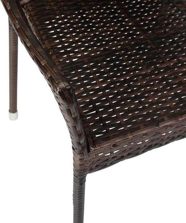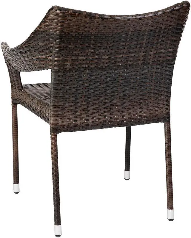 Curate an upmarket look at a budget friendly price in your home or business with this set of 4 stacking patio chairs. Featuring comfortably contoured, all weather PE rattan wicker seats with integrated arms, these outdoor dining chairs invite you to relax and linger. Powder coated steel tube frames are strong and durable and hold up to 300 lbs. static weight per chair. The UV coating ensures that these stack chairs look great season after season making them ideal for your restaurants outdoor dining area, hotel pool, or the backyard. With a recommended stack quantity of up to 22 chairs high, these indoor/outdoor chairs can be easily stored, transported, or moved out of the way for nightly cleanup.